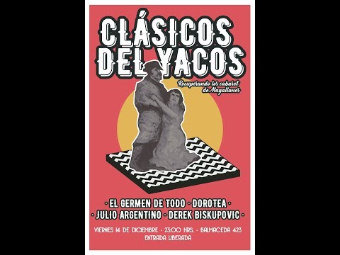 Registro del evento realizado en diciembre de este 2018 en el clasico local nocturno "Yacos" en la idea de recuperar diversos espacios clasicos de la bohemia magallanica de antaño y que forma parte de un proyecto mucho mas grande de mezclar la noche magallanica en vinculación a los artistas. En esta incipiente idea a cargo del destacado audiovisualista regional "Jorge Grez" logro reunir a cuatro exponentes de la escena que se presentaron en formato acústico y en concecuencia quedo este registro de poco menos de una hora que contiene material de "El Germen de Todo", "Derek Biskupovic", "Julio Argentino Diaz" y "Dorotea".